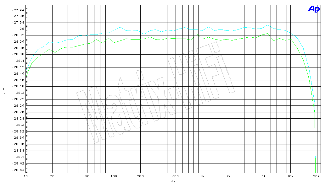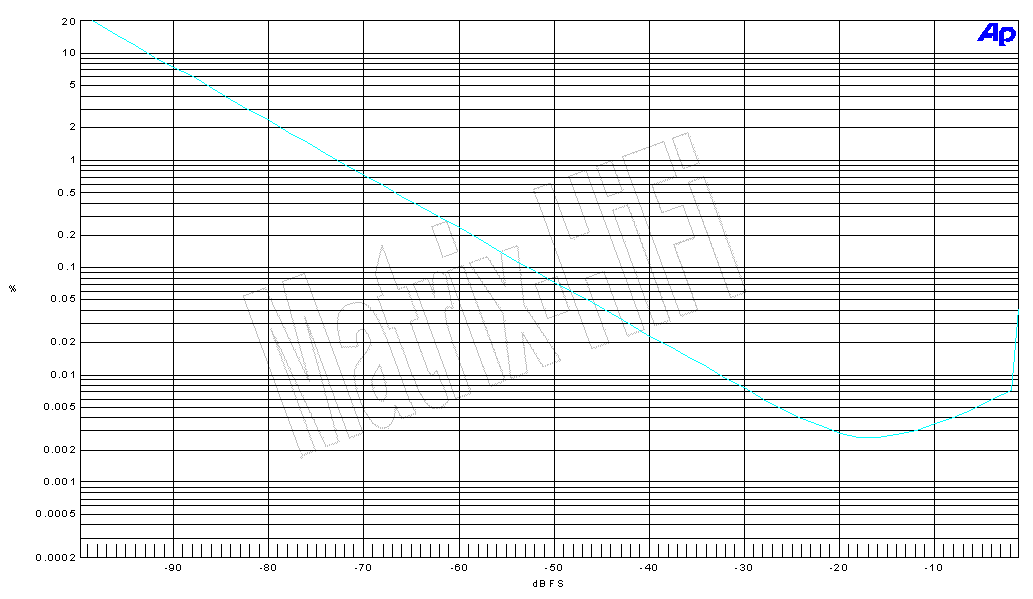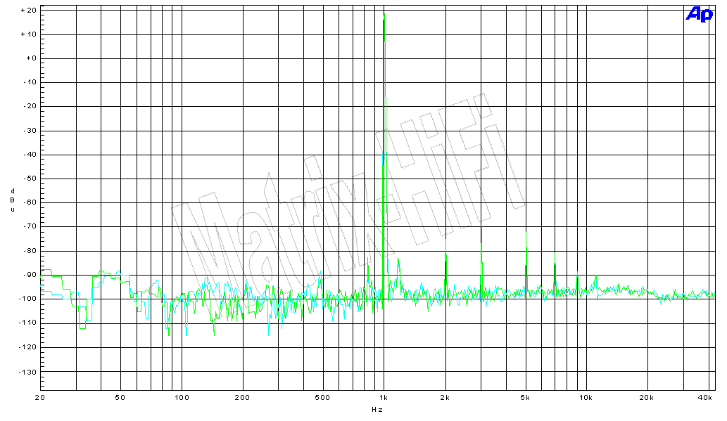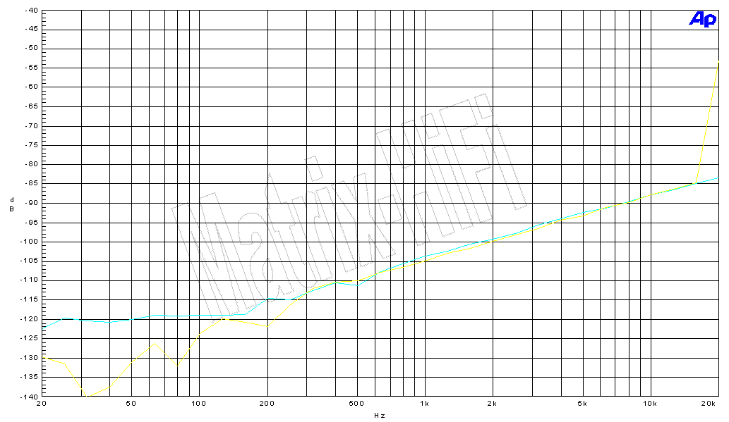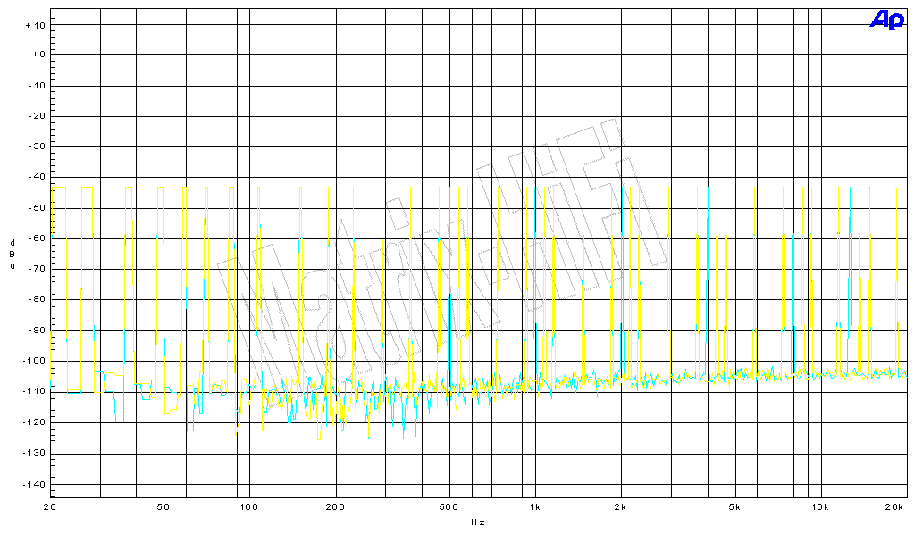 Gráfica que representa la distribución espectral del ruido de fondo . La frecuencia es de 44.100 Hz. Se utiliza una señal, tipo "zero digital silence" pero con dither añadido puesto que de no ser así, el equipo “mutea” (silencia) la señal proveniente de la salida del conversor. Es muy conveniente prestar atención a esto para no confundir las medidas con el ruido generado de los procesos analógicos. Ejemplar podríamos decir en su comportamiento.