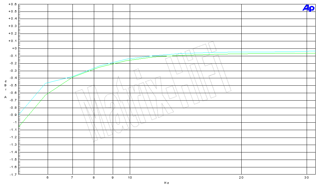 En esta gráfica podemos observar la respuesta en la zona más baja del espectro. Ejemplar podríamos decir de su respuesta. Las diferencias de nivel en los dos canales mostradas obedece a una limitación en la captura dual-chanel por el tipo de sincronismo utilizado para el posterior procesado de FFT. Para ser más pulcros deberíamos de efectuar una re-sincronía en la instrumentación, la cual, aumentaría la resolución de nivel en esta franja del espectro. No obstante, no hay nada que objetar pues estas sutiles diferencias son inapreciables a nuestro oído. Además … ¿y quién escucha infrasonidos en la zona de 7 Hz ..?