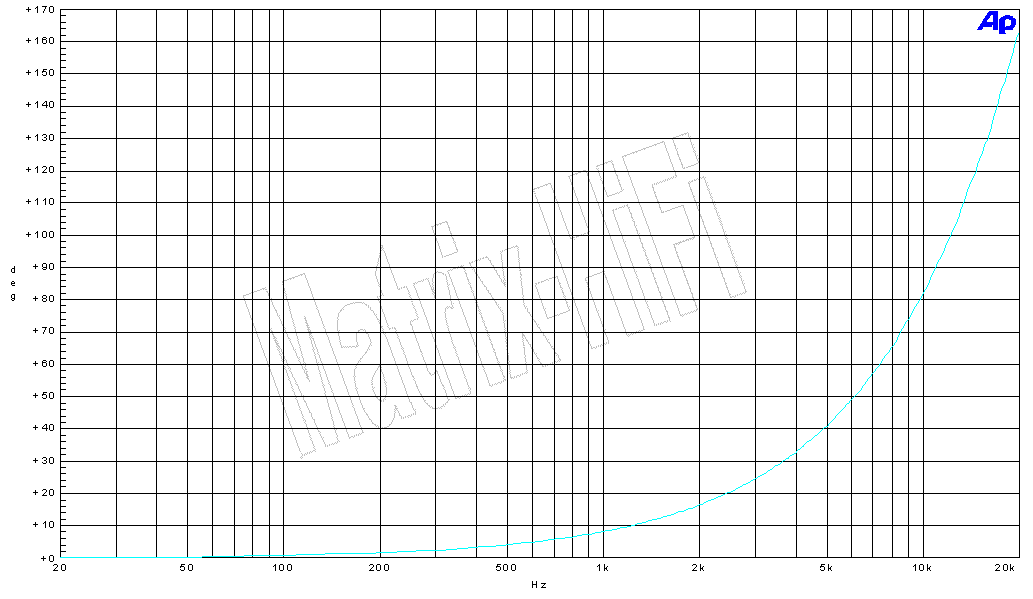 Respuesta fase-frecuencia. Como es de esperar de un procesador digital, el DEQ2496 mantiene una perfecta respuesta de fase lineal (la fase mantiene una proporción lineal con la frecuencia que queda representada como una curva exponencial cuando el eje de la frecuencias se muestra logarítmicamente). La consecuencia es que la respuesta se caracteriza por un retardo de grupo constante, que en el caso de esta medición corresponde exactamente al retardo de una muestra a 44100 muestras/s, esto es, a unos 23 μs aproximadamente. Parece, por tanto, razonable pensar que el retardo de grupo (o, lo que es lo mismo, la pendiente fase/frecuencia de esta gráfica) depende de la tasa de muestreo seleccionada. En todo caso, irreprochable.