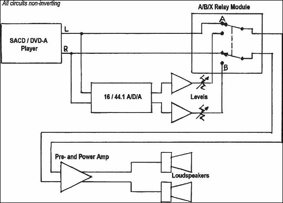 En todas las ocasiones, los sujetos probadores fueron sometidos a pruebas un tanto informales para determinar los límites de escucha de altas frecuencias de cada uno y así, poder conocer, si existiese alguna relación entre este parámetro y la capacidad de escuchar diferencias. Para el lazo de 16/44.1, usamos un grabador de CD profesional con capacidad de monitorado en tiempo real. Los niveles en ambos canales fueron ajustados en un margen de +/-0.1dB usando una etapa analógica de ganancia ajustable de muy alto rendimiento, que se encontraba siempre en el camino de la señal de 16/44.1.