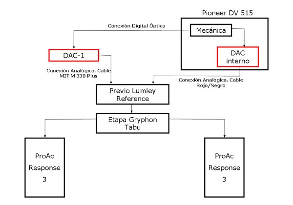 De esta forma la misma señal leída por el transporte del DVD Pioneer se procesa por dos conversores distintos, el interno del mismo DVD y el del DAC-1 y se envía a dos entradas distintas del previo pasivo.