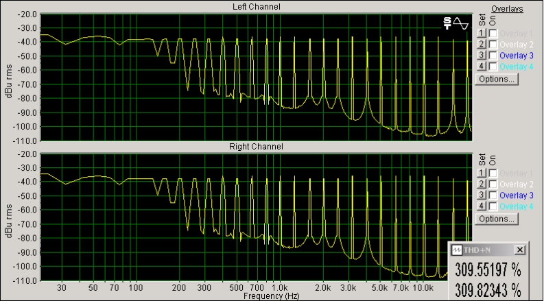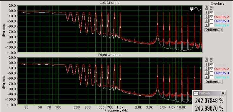 Forsell +Audio Note DAC 4 Token CD-50 Respuesta a señal Multitono limitada en la zona de medias frecuencias. Se observa en la gráfica izquierda (Forsell + Audionote) un cierto nivel de ruido en comparación con la otra gráfica. Sin duda podría deberse al comportamiento intrínseco de las electrónicas a válvulas. O tal vez al modo de decodificación que tiene este conversor digital-analógico.