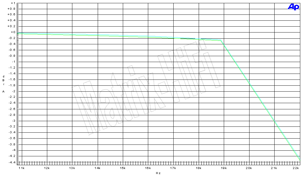 Gráfica que nos muestra la respuesta del pasabajos a la frecuencia de corte. Obsérvese que a –3 dBr la frecuencia de corte se sitúa en 21 Khz. Nada que objetar al respecto del típico filtrado digital. Frecuencia de muestreo 44,100 Hz