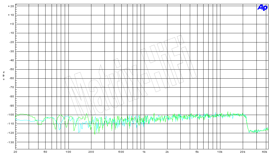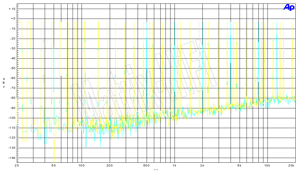 Gráfica que representa la distribución espectral del ruido de fondo . La frecuencia es de 44.100 Hz. Se utiliza una señal, tipo "zero digital silence" pero con dither añadido puesto que de no ser así, el equipo “mutea” (silencia) la señal proveniente de la salida del conversor. Es muy conveniente prestar atención a esto para no confundir las medidas con el ruido generado de los procesos analógicos. Ejemplar podríamos decir en su comportamiento.