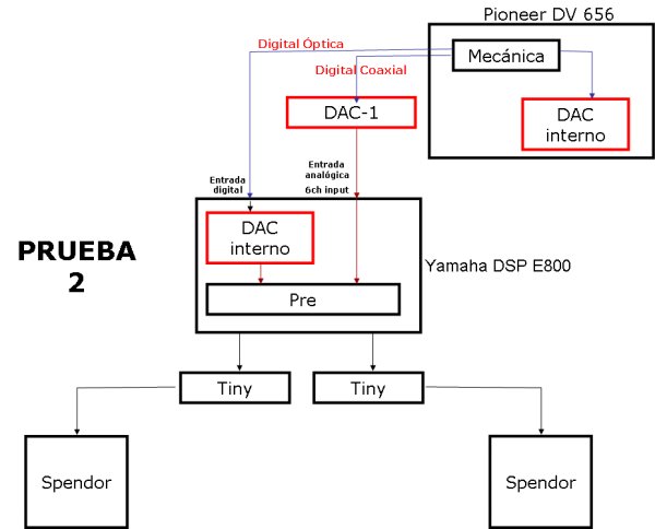 Hemos realizado una prueba de la conversion que realiza el DVD Pioneer 656A contra la del procesador Yamaha DSPE800, para saber si suenan iguales, mediante prueba ciega.