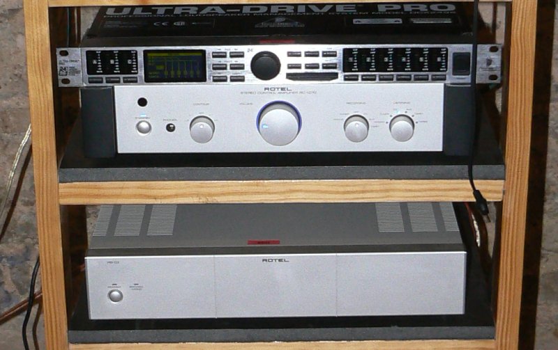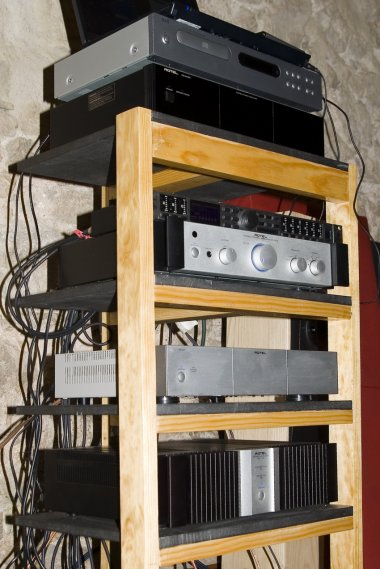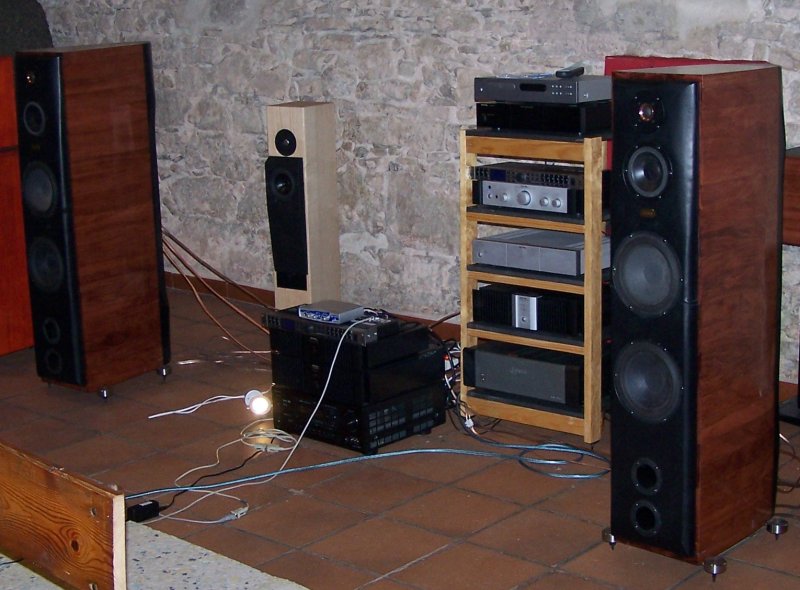 Comentarios: El equipo de Edu es activo, con amplificación para cada vía usando el filtro activo de Behringer. Sin embargo, la parte más destacable de su equipo son, sin duda, sus cajas, diseñadas y realizadas íntegramente por él. A continuación mostramos una breve descripción de las mismas: Son unas cajas activas de 3 víaas con trasductores de alta gama y realizadas en configuración bass reflex con 2 puertos en la parte delantera. Esta construida en su parte interior con refuerzos de madera de MDF y en su parte exterior con madera natural y maciza de Bubinga. Además está forrada de piel para darle un aspecto todavía más elegante y lujoso como las mejores realizaciones de Sonus Faber. Los altavoces son los Siguientes. Para la vía de graves, 2 Scan