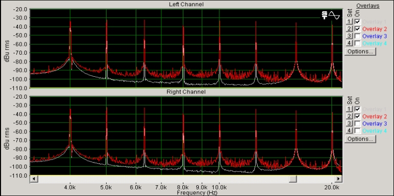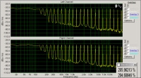 Forsell +Audio Note DAC 4 Token CD-50 Respuesta a señal Multitono limitada en la zona de medias frecuencias. Se observa en la gráfica izquierda (Forsell + Audionote) un cierto nivel de ruido en comparación con la otra gráfica. Sin duda podría deberse al comportamiento intrínseco de las electrónicas a válvulas. O tal vez al modo de decodificación que tiene este conversor digital-analógico.