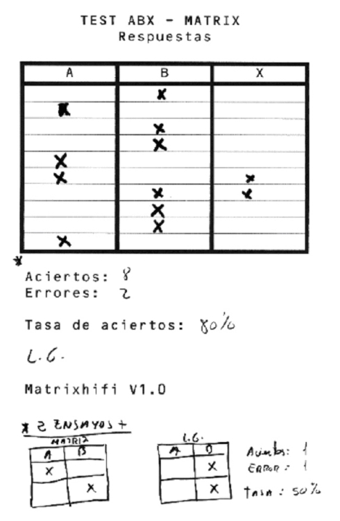 Matriz inicial que indicaba que lector debía de empezar a sonar primero en cada una de las diez escuchas Hoja de resultados de B.F. Hoja de resultados de L.G.